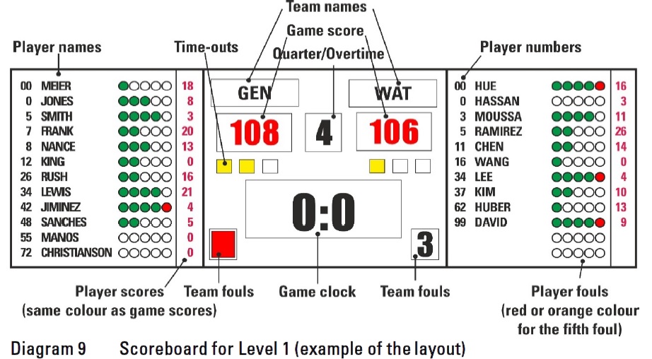 - Os quadros eletrónicos (dois) para além do relógio de jogo terão obrigatoriamente, informação sobre as equipas e nomes e números dos jogadores, pontos, faltas cometidas, time out, relógio para contar time out (facultativo).