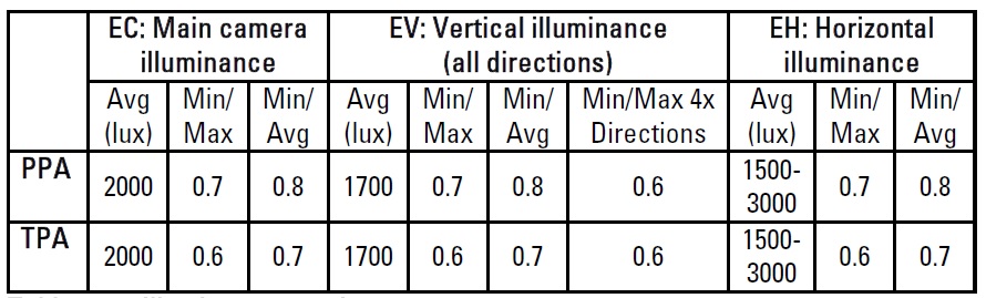 Como referência apresentamos o quadro seguinte com as características (Ref. FIBA Basketball Equipment) que a iluminação deverá ter para possibilitar a transmissão televisiva de competições de basquetebol.